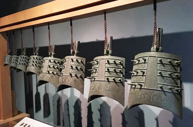 博物馆里最负盛名的钟无过于战国曾侯乙编钟。曾侯乙编钟钟架呈曲尺形,长架长七米多,短架长三米多,高两米六,是迄今为止发现规模最大、保存最好、音律最全、音域最广的古代乐器。这架编钟也是古代编钟所拥有钟的数量最多的一个,一共有镈钟、甬钟、钮钟六十五件,全都是双音钟。也就是说,一个钟可以演奏两个不同高度的音,可以旋宫转调。这架编钟的钟的钲部、正鼓位、侧鼓位及钟架上都有铭文,标注了音高、乐律以及同样的概念在曾国以外他国的对应名称。也就是说,这个钟正鼓位敲出的音高,在某诸侯国相当于它的哪个音高,曾侯乙编钟都做了注明。证明了曾侯乙是个实实在在的音乐高手。