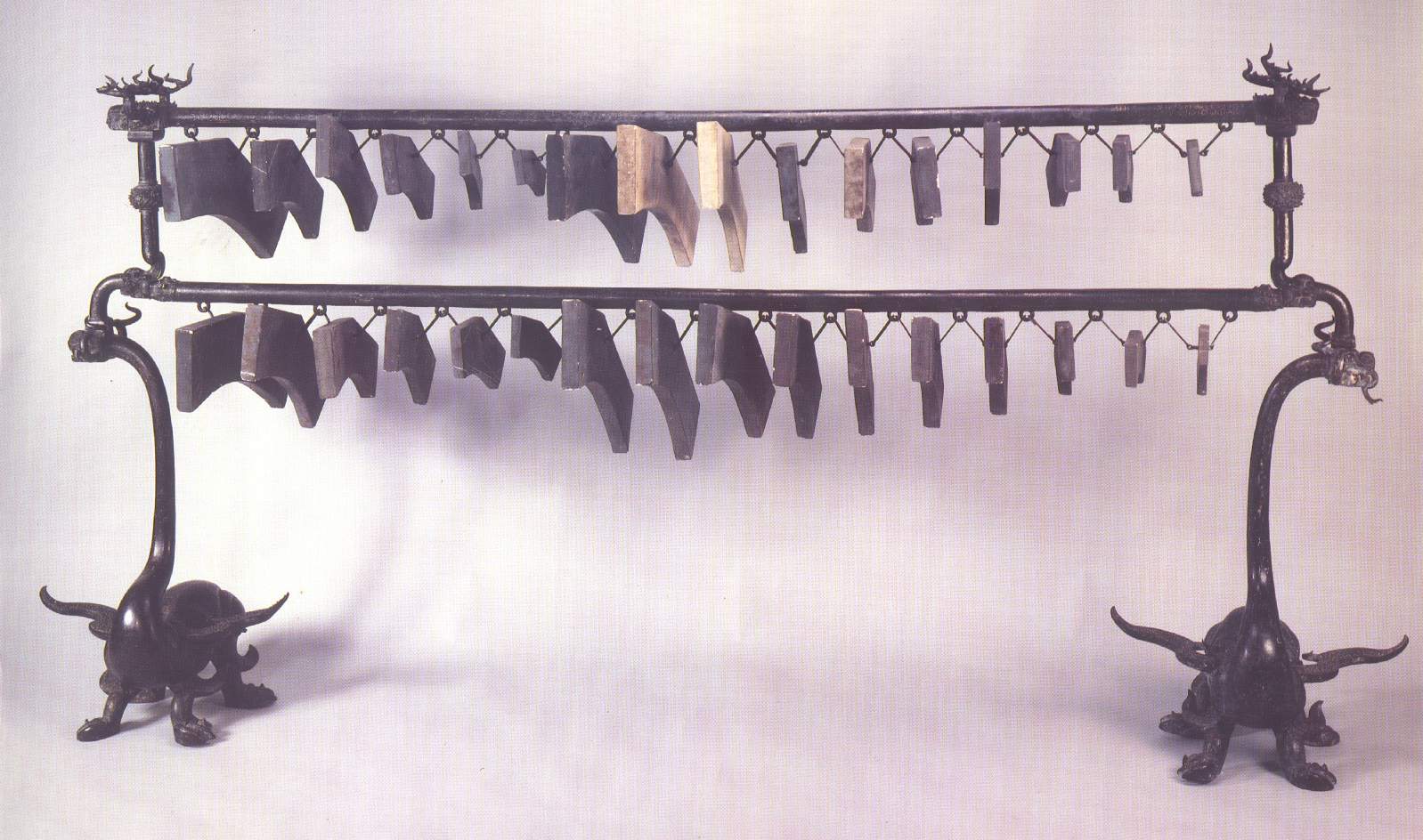 曾侯乙编磬 击奏体鸣乐器。击奏体鸣乐器。共41片,音域:ba-c4,半音齐全。通常悬於架上的有32片未悬於架上的9片磬闲置待用,是迄今所见规模最大的编磬。 QING: LITHOPHONE Struck idiophone, qing (lithophone) with 41 p...