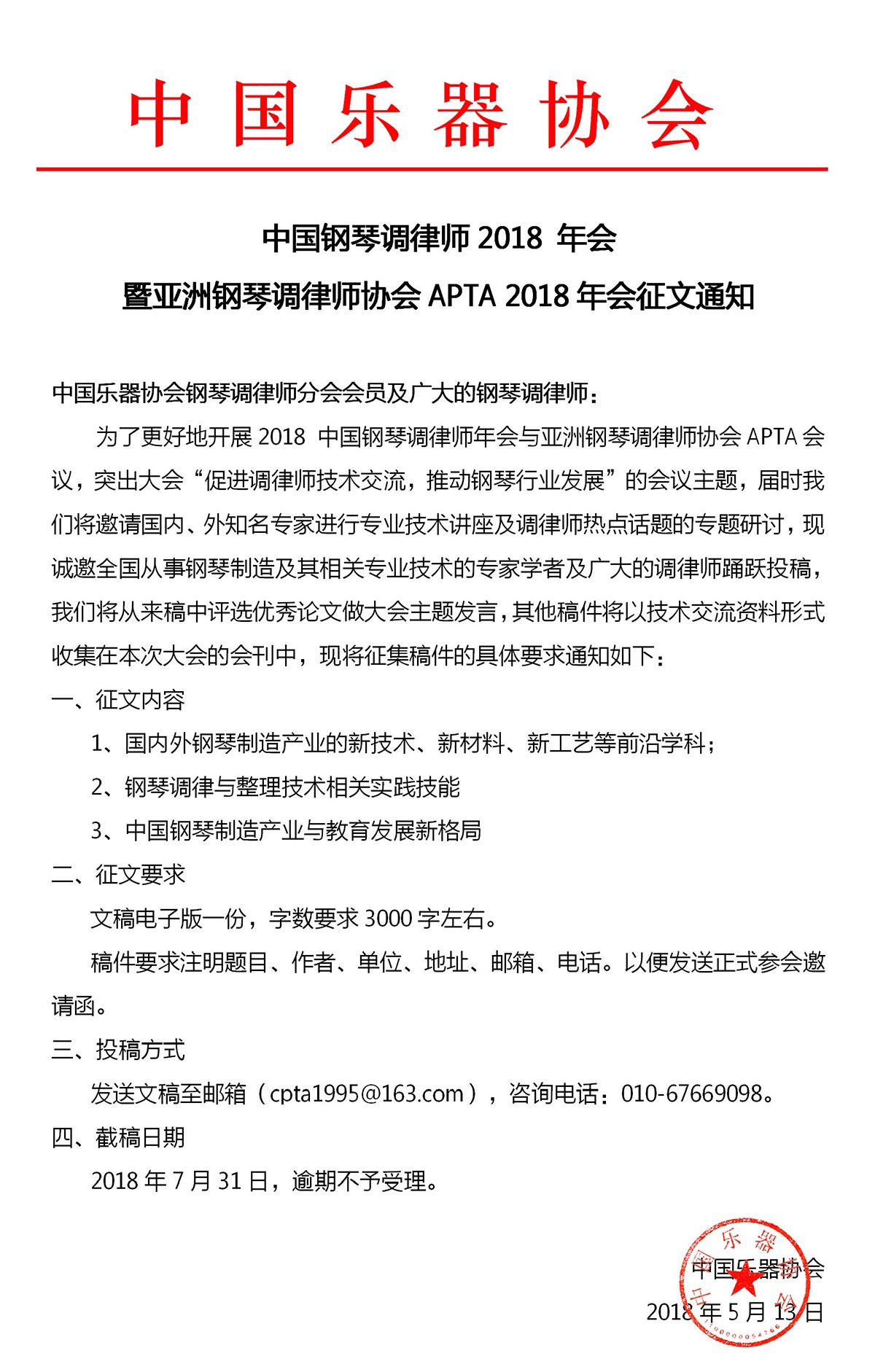中国钢琴调律师2018 年会暨亚洲钢琴调律师协会APTA 2018年会征文通知